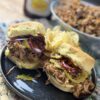 - Pull apart the pork and toss with 1⁄4 cup pan juices.
